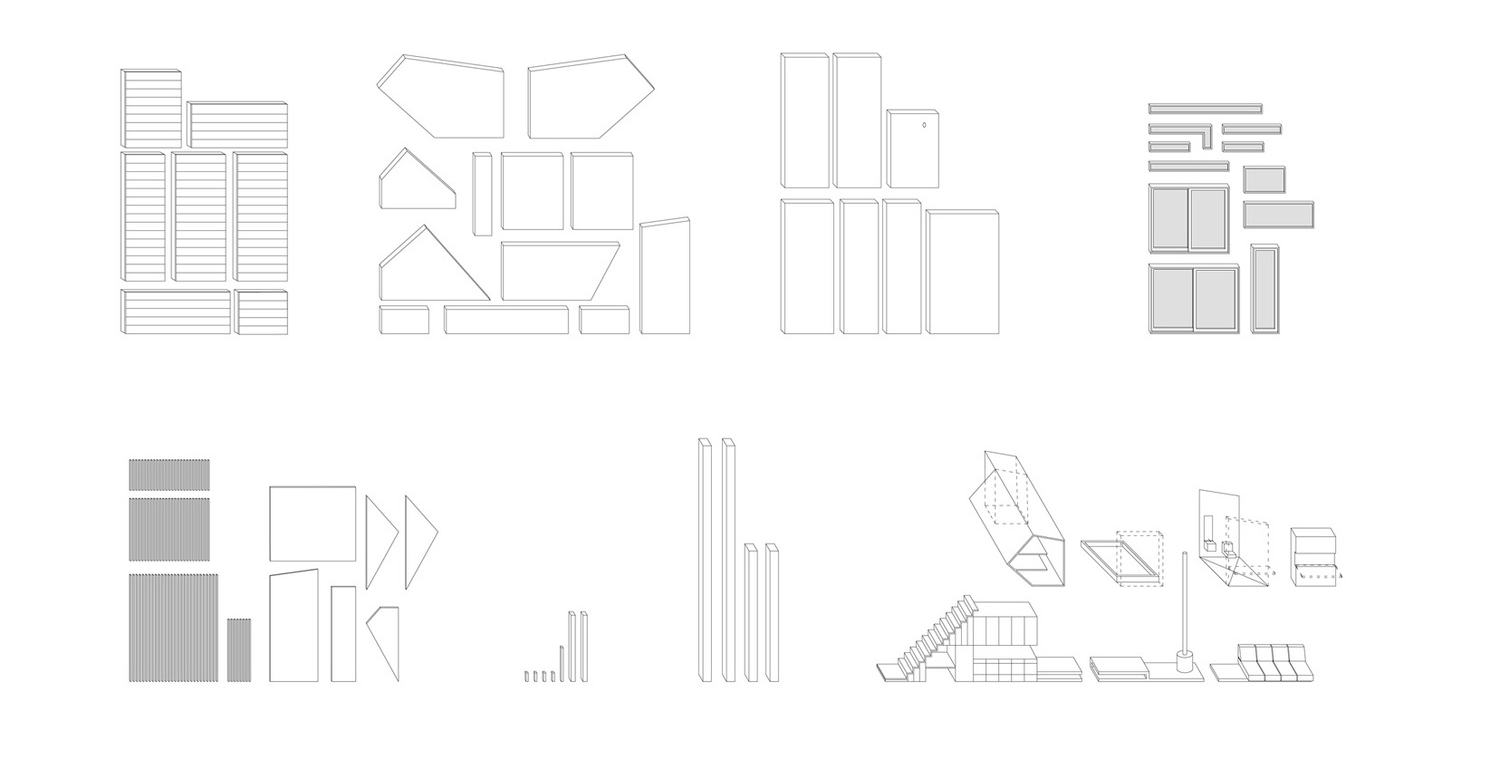 Horizontal windows that are not filtered by screens can be outfitted with a frosted film, for complete privacy on all sides, to suit any siting condition. The canted dormer-like volumes that fall outside the house's defined floor area provide voluminous storage space. Additionally, all available voids in the seating and stair are designated as storage compartments, collectively creating 300 cubic feet of storage.