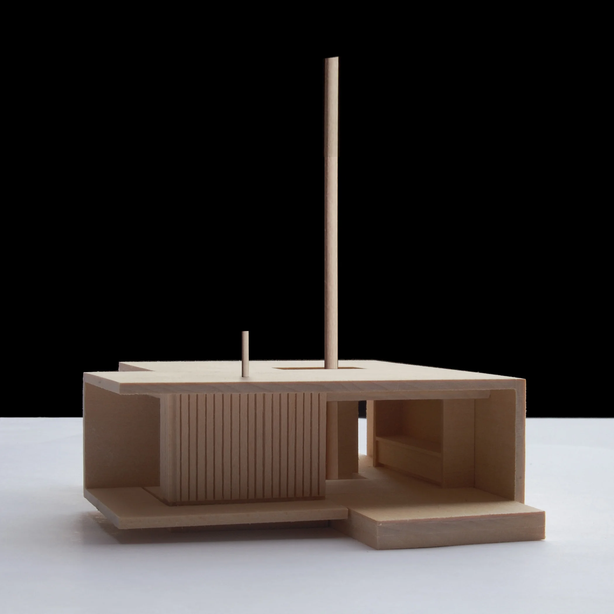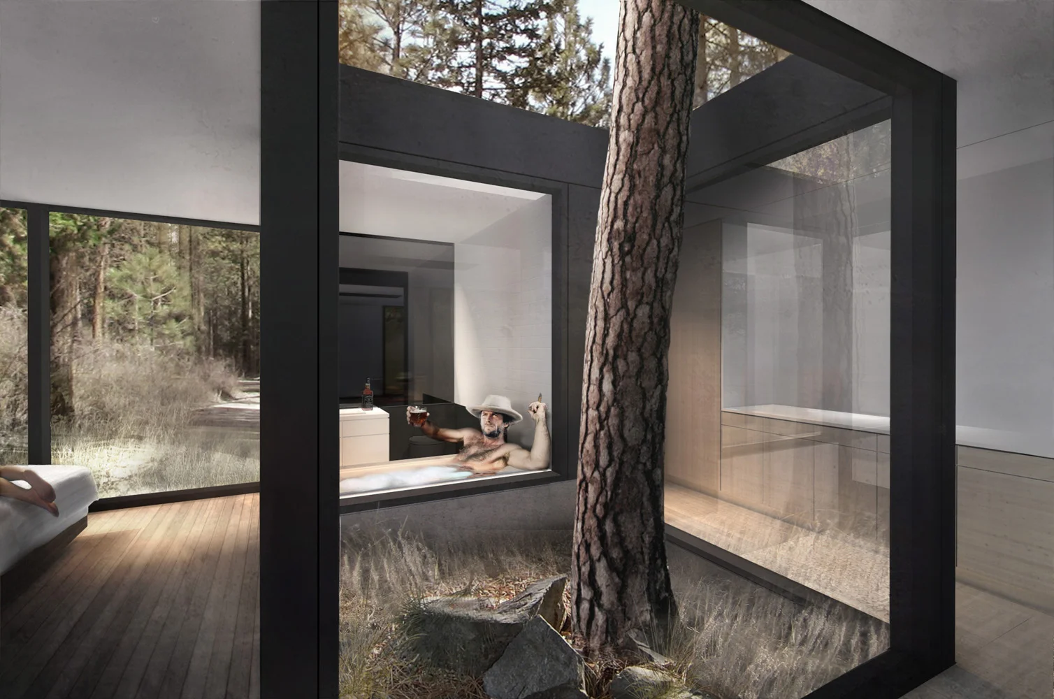 Since The Cowboy's footprint is so small, its concept is potently singular. The cabin's parti is a literal realization of the familiar scene in many western genre movies where a cowboy is bathing, usually in the centre of a room, keeping all friends and foes in clear sight. Similarly, this cabin's central courtyard allows its bathtub to survey the lay of the land, inside and out. The formal "hole" in the house will contain one lone tree, an iconic reminder of nature's quiet insistence.